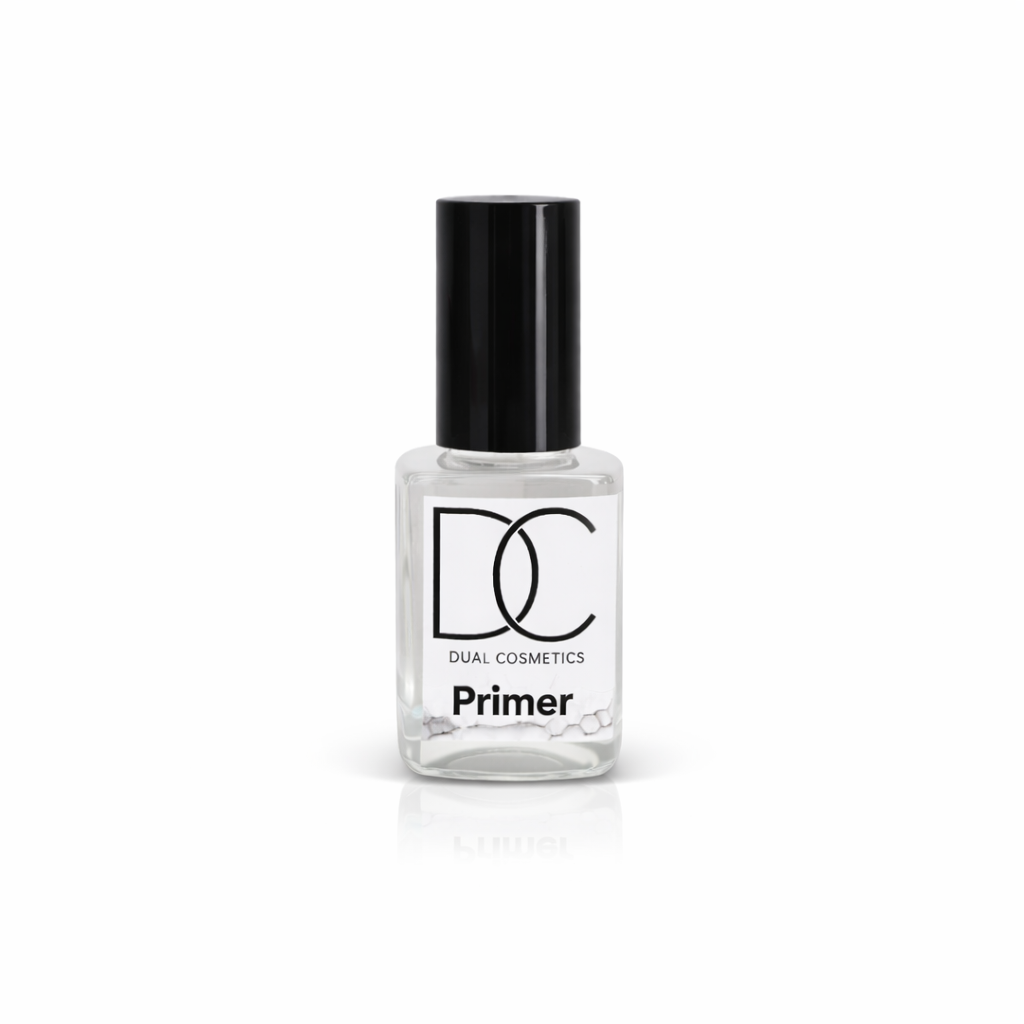 Frasco de Primer Dual Cosmetics em vidro transparente com tampa preta